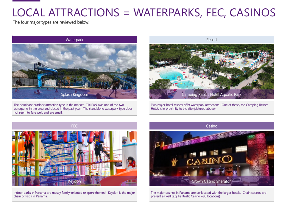 1. To reiterate, the market is quite limited in Panama. The overnight tourist population outnumbers qualified residents. At moderate penetration rates, the market likely would not support a theme park of over 1.5 million in annual visitation.