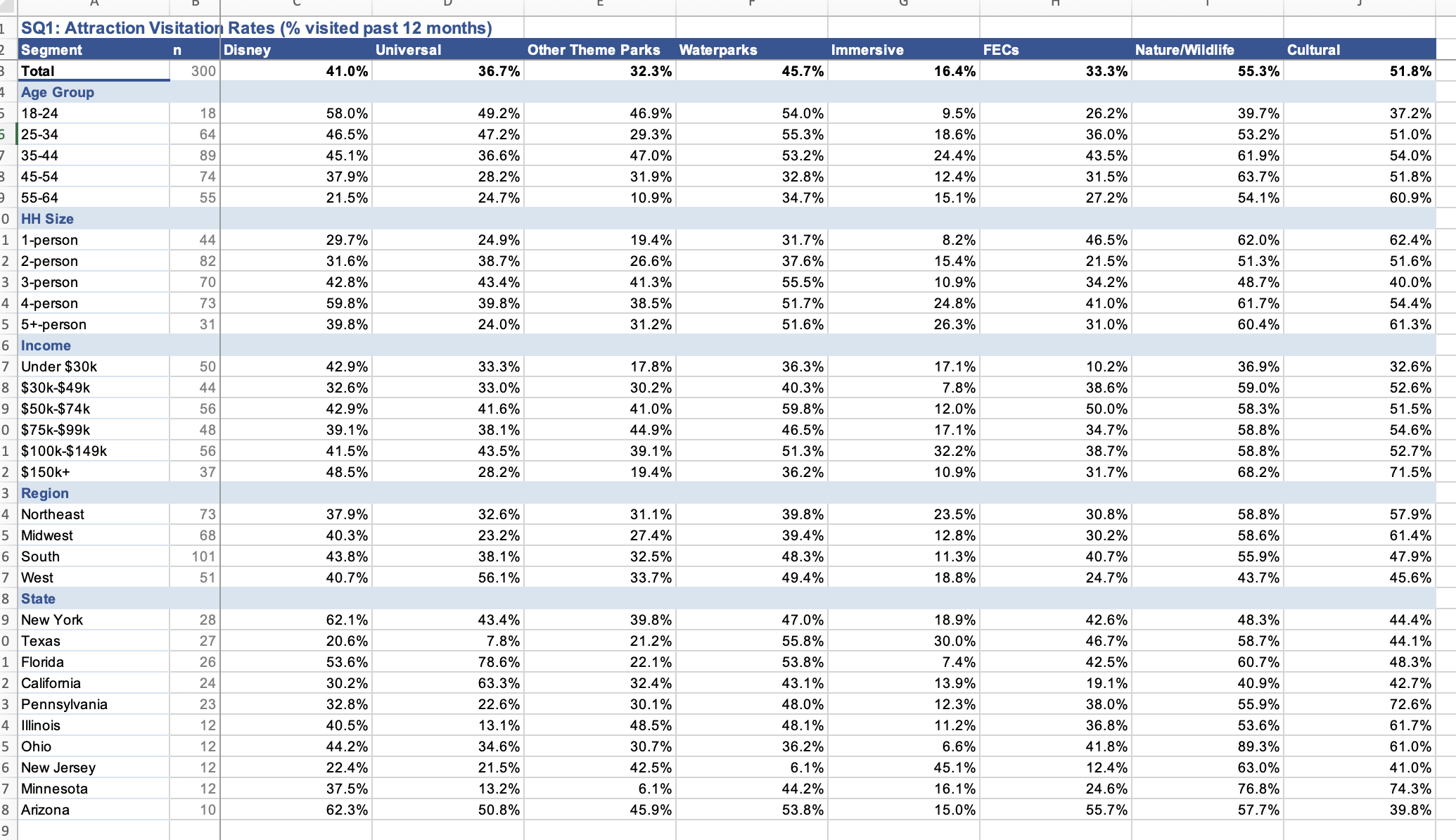 Visitation rates: Weighted visitation rates across Disney, Universal, other theme parks, waterparks, immersive/interactive experiences, FECs, nature/wildlife attractions, and cultural venues – broken out by age group, household size, income tier, U.S. region, and state.
